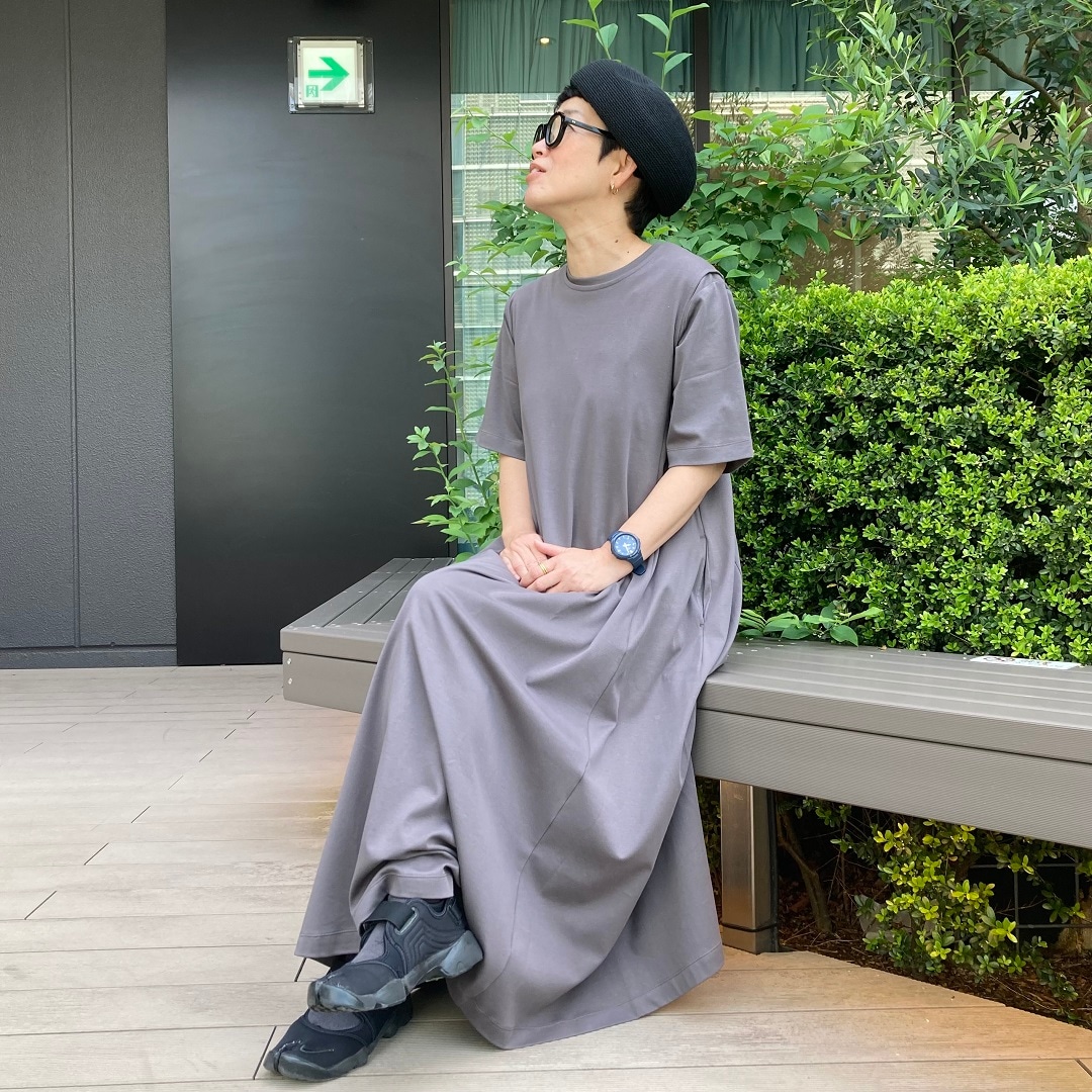 こちらのスタッフはTシャツとワンピースを同系色で重ねてコーディネートしています。
