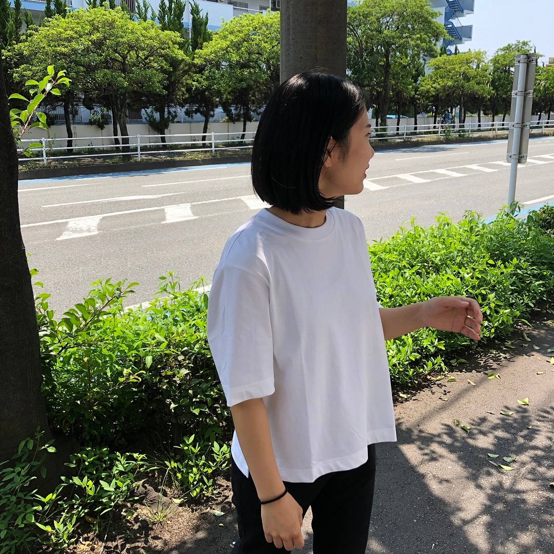 着丈は長すぎないため、シンプルな定番Tシャツとして、いろんなコーディネートに活躍するTシャツです。