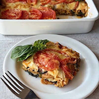 【調布パルコ】ミートグラタンの素を使用した フェットチーネでつくるトマトとほうれん草のラザニア風