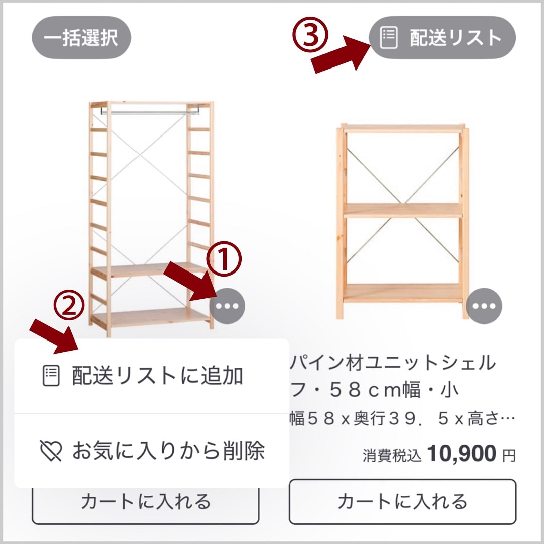 - お気に入り一覧から、配送したい商品の「・・・」ボタンを押す。