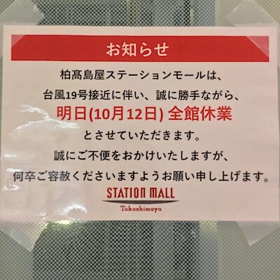 【柏ステーションモール】【臨時休業・営業時間変更のお知らせ】 2019/10/11