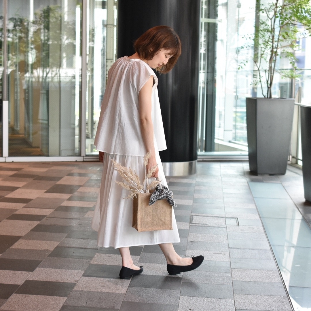 オールホワイトのコーディネートの足元にはブラックのバレエシューズを合わせ引き締めました。