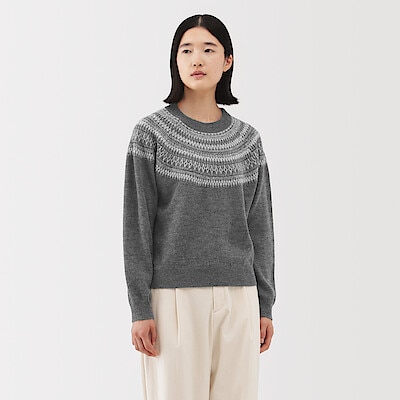 ジャガード編みニットは丈が短めなのでどんなボトムスとも合わせやすくスッキリと着こなせます。
