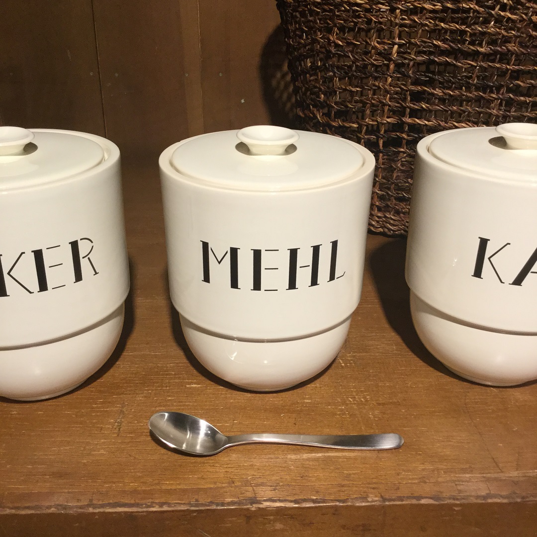 テオドール・ボーグラーはバウハウスで活動をしていた陶芸家で、機能性と芸術性を兼ね備えた陶器を多く手がけてきました。このポットたちも至極シンプルなデザインながら、他に無いオリジナリティ溢れる形状やフォントで作られています。そのままオブジェとしていくつも並べてご家庭で使っても良さそうですし、塩(ZALZ)小麦(MEHL)砂糖(ZUCKER)、コーヒー(KAFFEE)と書かれたとおりに調味料を入れても活躍します。