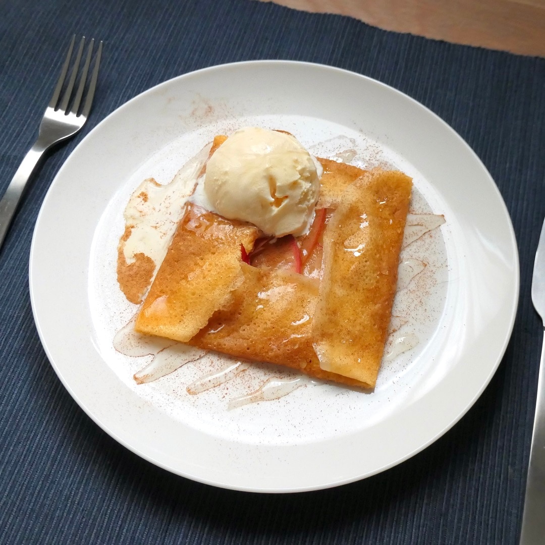※今回は、りんごのはちみつ煮・クレープ生地、ともに前の晩に仕込みをして、一晩寝かせています。