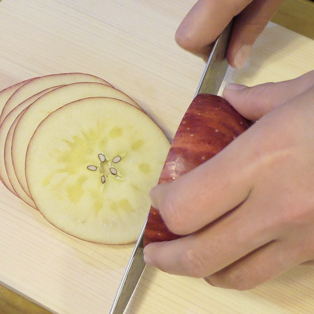 りんごを薄切りにして、芯を取りましょう。