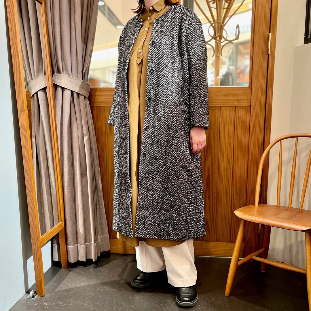 日本最大の毛織物の産地として知られる、尾州の生地工場に眠っていた上質な残糸を使って織られた、ヘリンボーン柄のロングコート。
