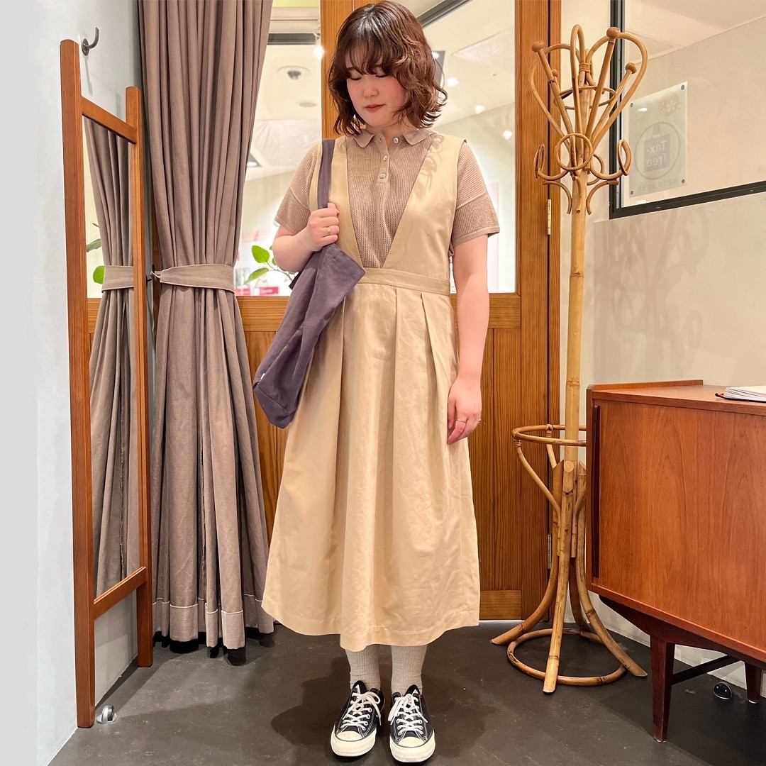 深めのVネックで、トップスとのレイヤードコーディネートが楽しめるジャンパードレス。