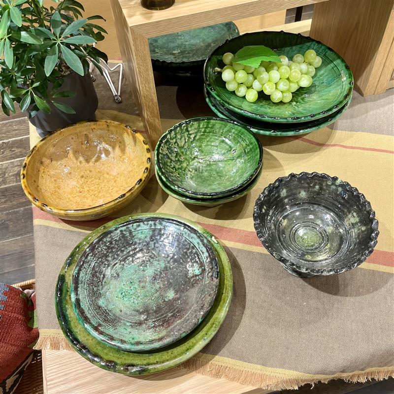 気泡がたくさん入った、この個性豊かなグラス類が人気で、皆さん一つ一つ見比べて選ばれています。モロッコの日常を身近に感じられるようですね。
