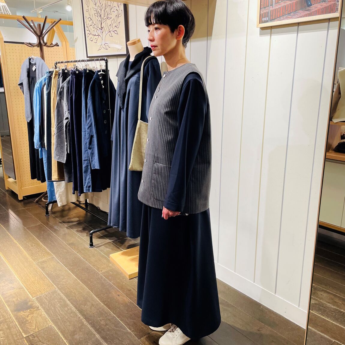 お勧めはベスト。ベーシックなラインは軽めのワンピースと合わせたり、Tシャツに合わせて来ても様になる万能なベストです。