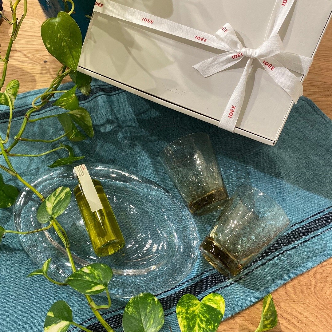 □菅原工芸硝子ガラスオーバル皿クリア\3,850 □菅原工芸硝子9オンスグラス\1,760 □オリーブオイル白トリュフ\2,052 □Harmony textileキッチンタオル\1,980(すべて税込)