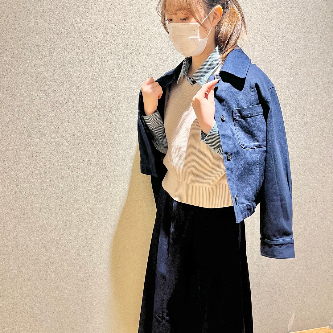カポックを使ったジャケットとマキシ丈スカートに、ショート丈のベストとブロードのシャツを合わせて。