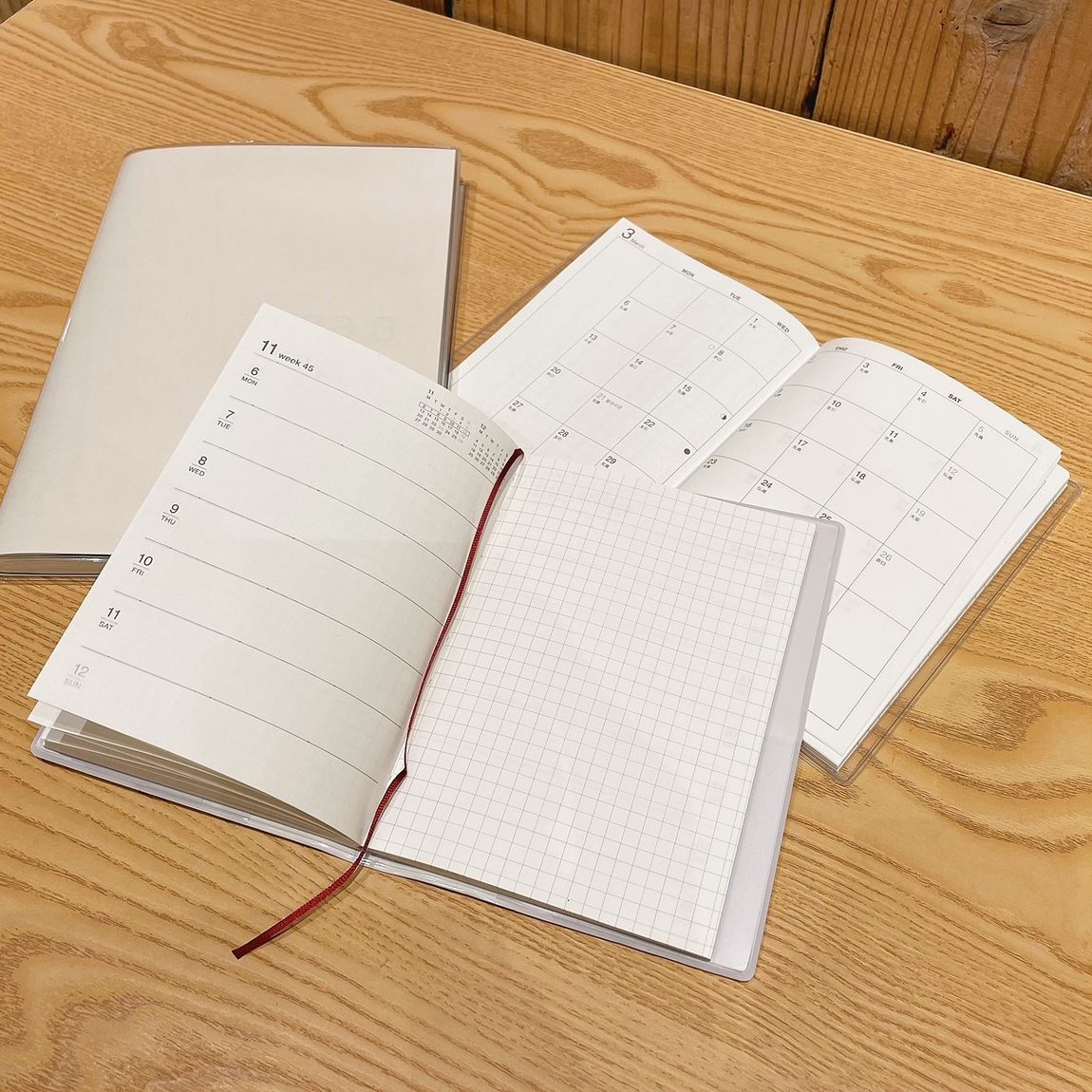 マンスリーウィークリーは「見開き1ヶ月」「週間レフトタイプ(見開き左は1週間・右は方眼フリースペース)」と方眼フリーページの付いたノートです。