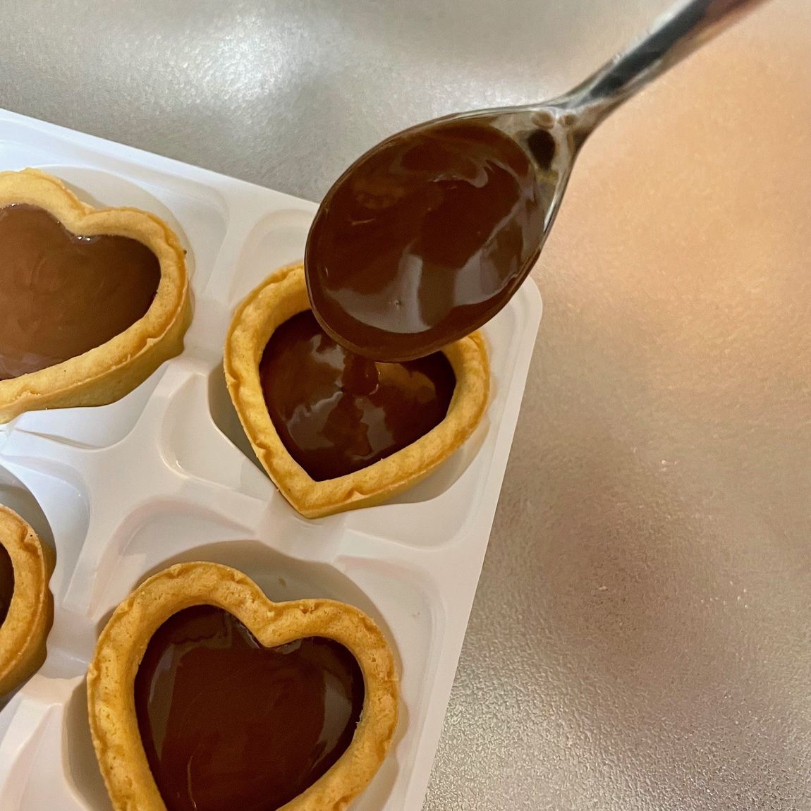 ③スプーンでタルトにチョコレートを均等に流し入れます。