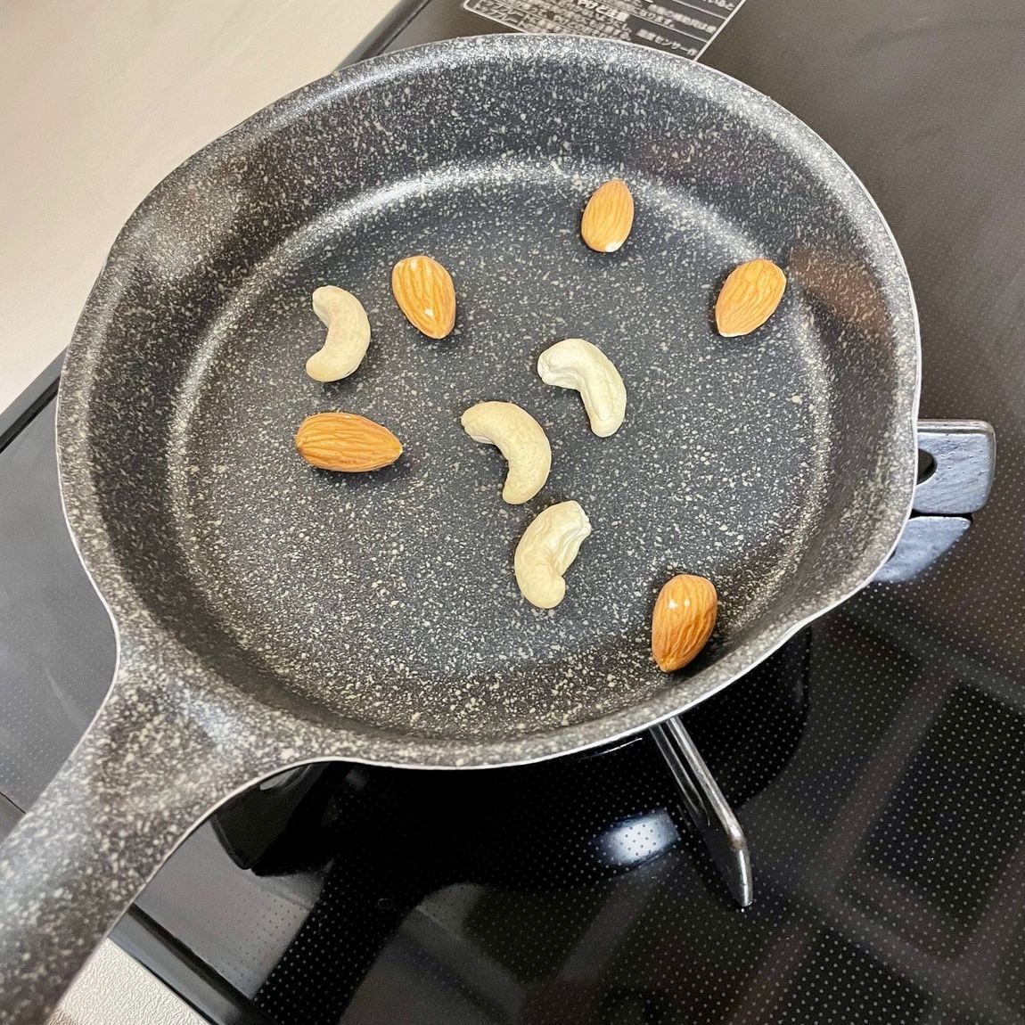 ①フライパンでミックスナッツを弱火で炒ります。香ばしい香りがしたらすぐに火を止めます。