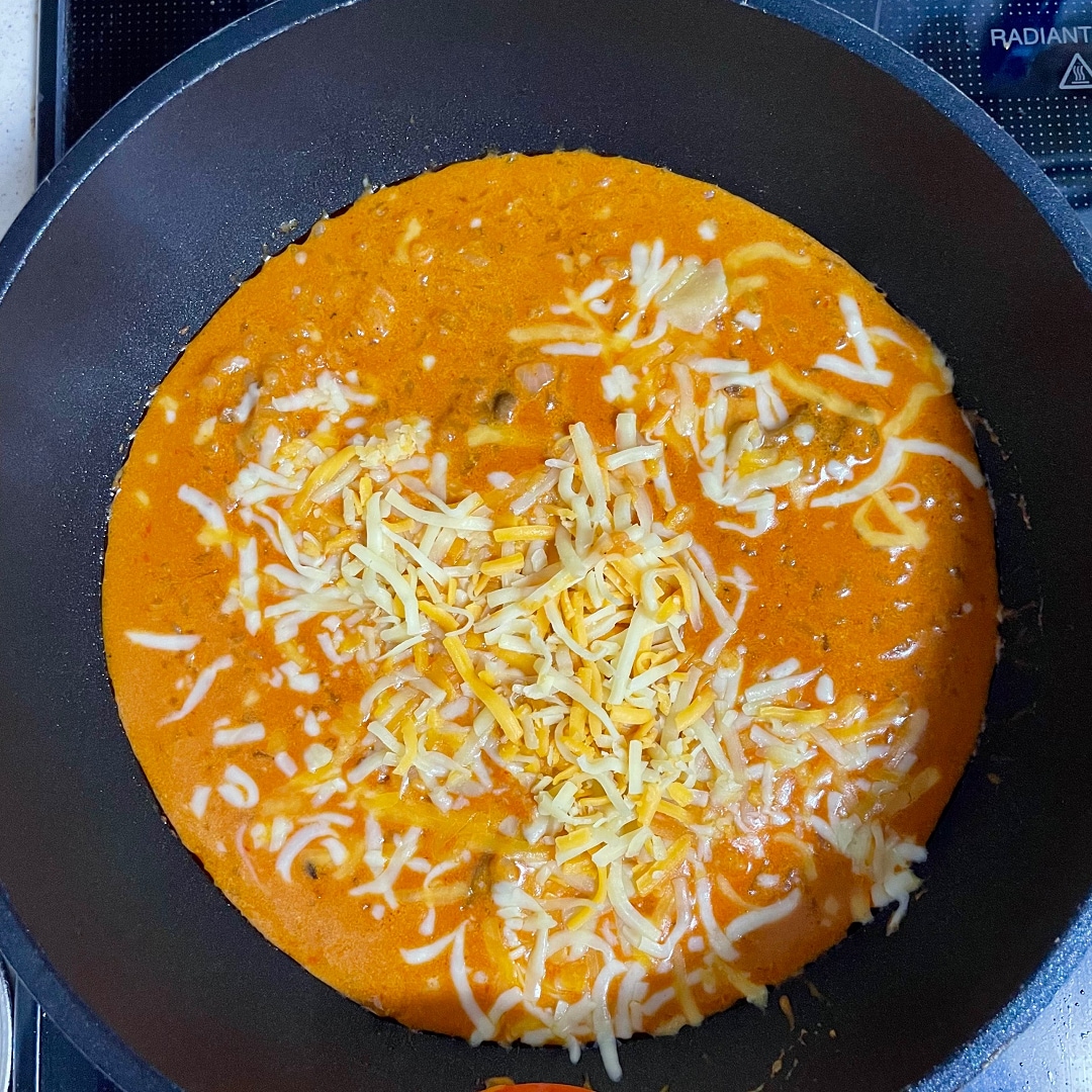 お粥状にとろりとしてきたらチーズを加え、溶かしながら混ぜ合わせる。