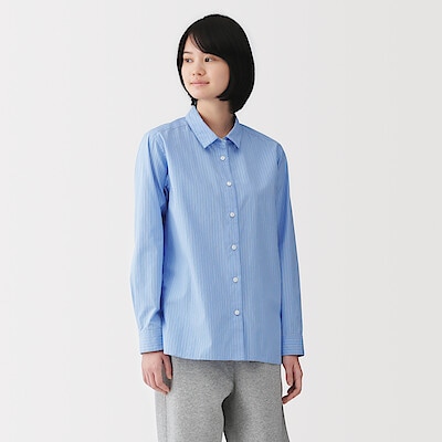 婦人 洗いざらし ブロードレギュラーカラー長袖シャツ 婦人S・サックスブルーストライプ