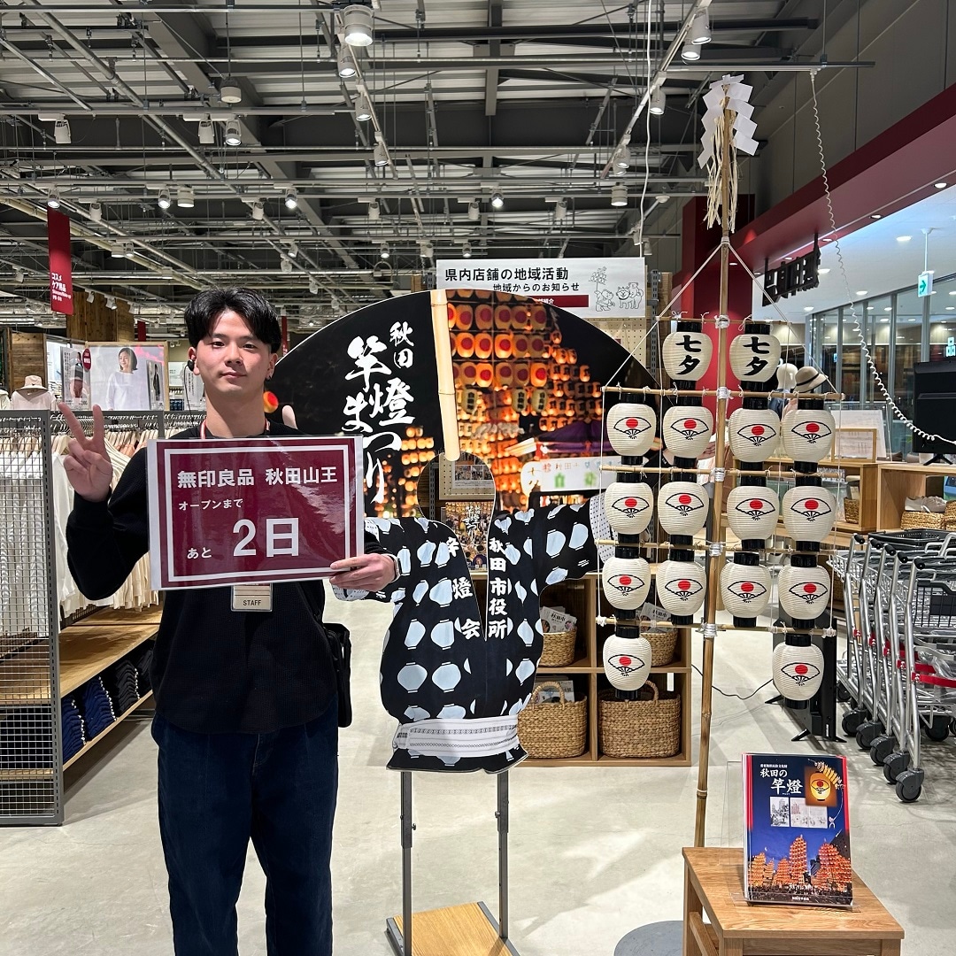 無印良品 秋田山王では、市内最大の店舗として地元を盛り上げたいと考え、ミニ竿灯を展示しております。また、オープン記念として顔出しパネルも設置しております。