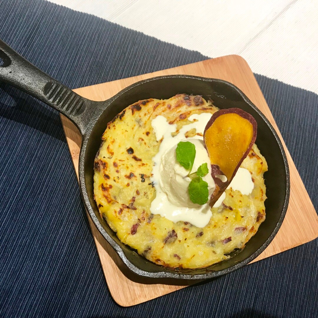 それをあつあつのスキレットの上にのせ、さらに冷たいバニラアイスをのせた、温と冷を一緒に感じることができるデザートです。