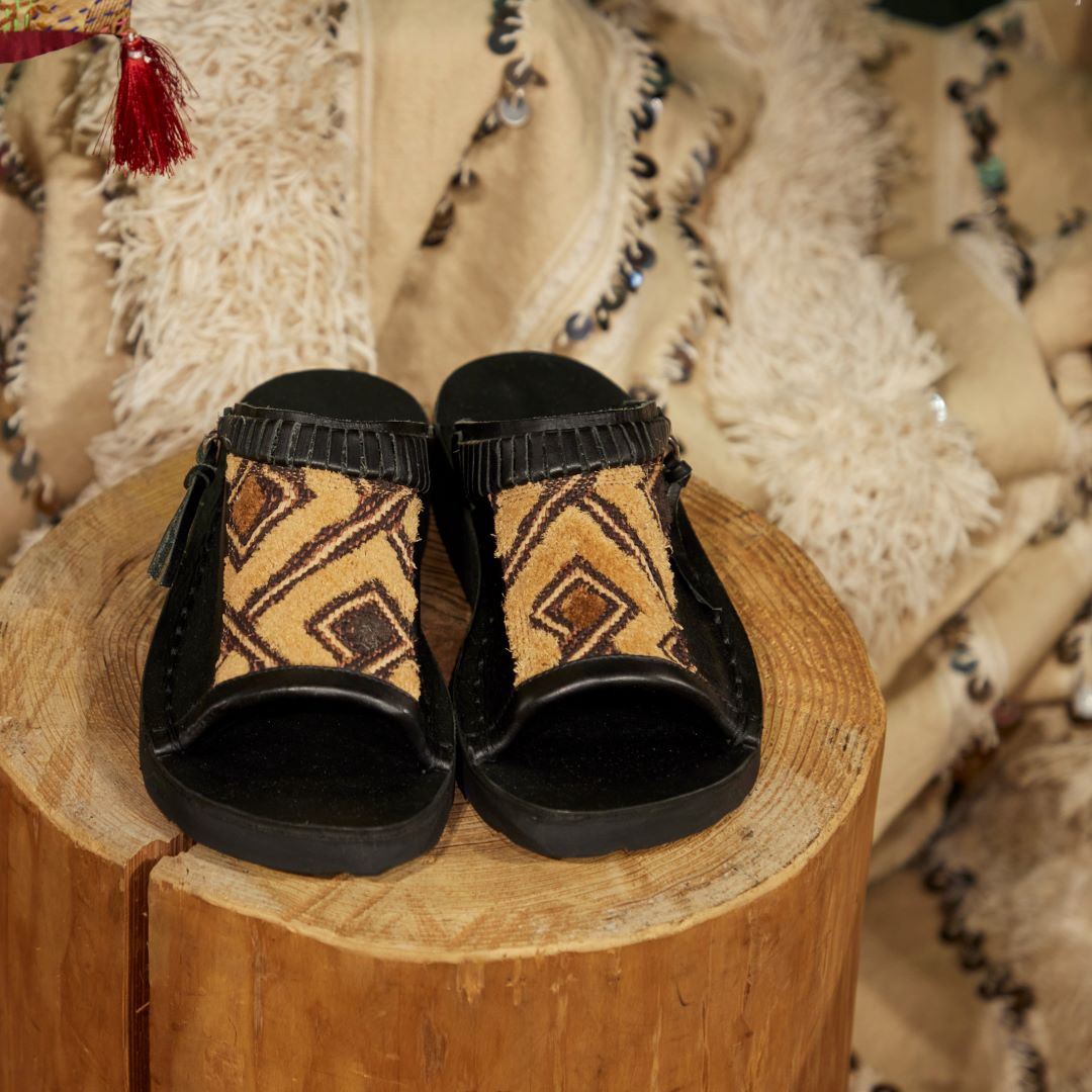 ショワ族がつくる伝統的な草ビロード「クバ布」の貴重なヴィンテージ生地の端切れをあしらったサンダルは、長時間履いても疲れにくく、一つとして同じものがありません。