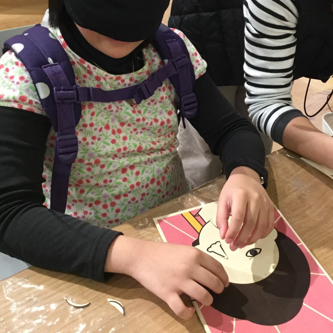 4種類の台紙から好きなものを選び、無印良品の顔スタンプを押して各パーツに切り取り、福笑いを行いました。
