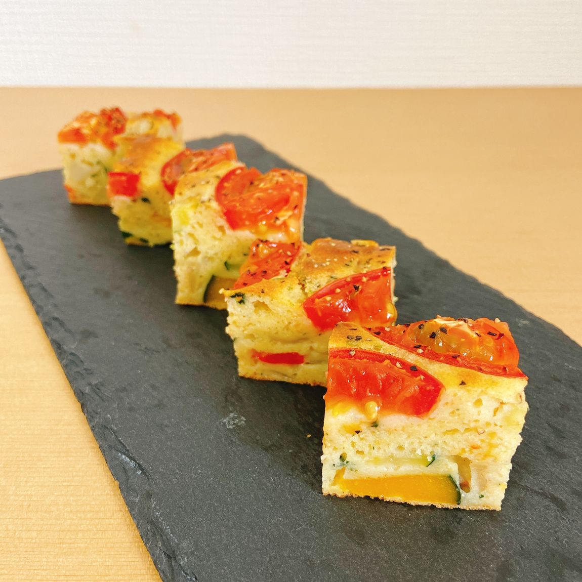 4.2の生地に3の野菜を入れて混ぜ、オーブンシートを敷いた型に流してトマトをのせる。(お好みであらびき胡椒を振る。)