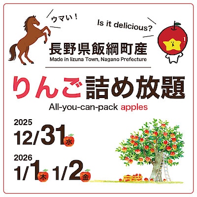 【直江津】12月31日(水)-1月2日(金)『飯綱町産りんごの詰め放題』開催のお知らせ|December 31st (Wed) - January 2nd (Fri) "All-You-Can-Pack Iizuna Town Apples" Event Announcement