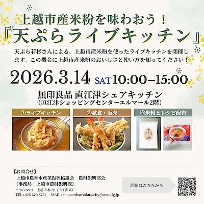 【直江津】3月14日(土)『上越市産米粉を味わおう!天ぷらライブキッチン』開催のお知らせ|シェアキッチン