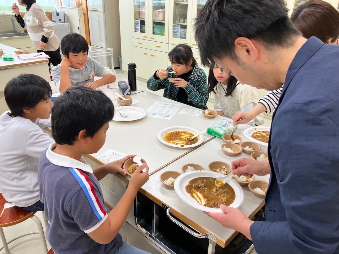子どもたちは、にしき食品さんと協力し、3回の試作試食会を実施しました。サメ肉に合う和だしをベースに、具材には大きめにカットしたじゃがいも、たまねぎ、そしてヨシキリザメの肉を使用しました。さらに、上越市が古くから発酵食品の製造が盛んなことから、山本味噌醸造場さんの味噌を隠し味に加え、カレーソースに深みを持たせました。子どもたちはスパイスの配合や辛さのバランスにもこだわり、子どもから大人まで楽しめる絶妙な味わいを追求しました。