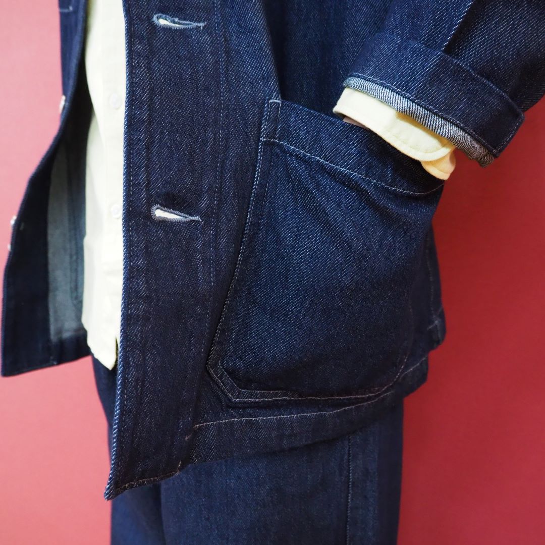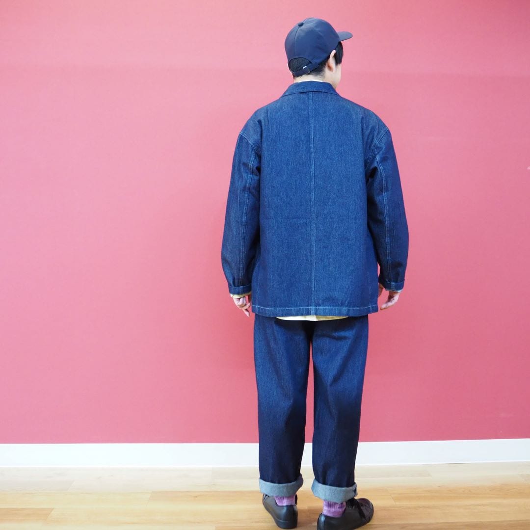 木の実から作ったカポック混のデニムカバーオールとデニムワークパンツを合わせてセットアップスタイルにしました。ライトイエローのシャツを合わせることによって明るい雰囲気になります。