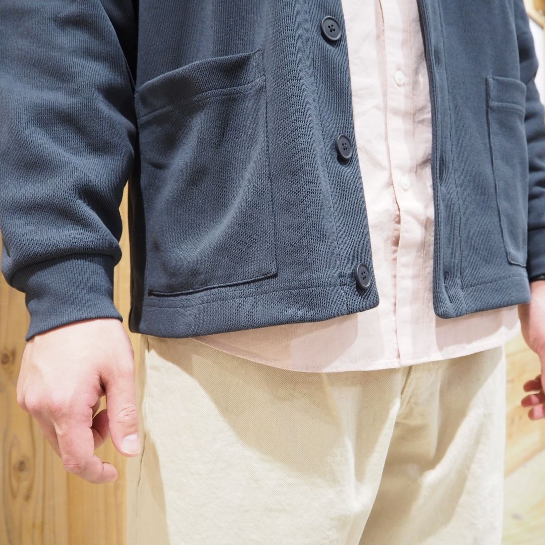 ゆとりあるVネックカーディガンに春らしい色合いのシャツと、ゆったりとしたシルエットのワークパンツを合わせたらやわらかい印象になります。