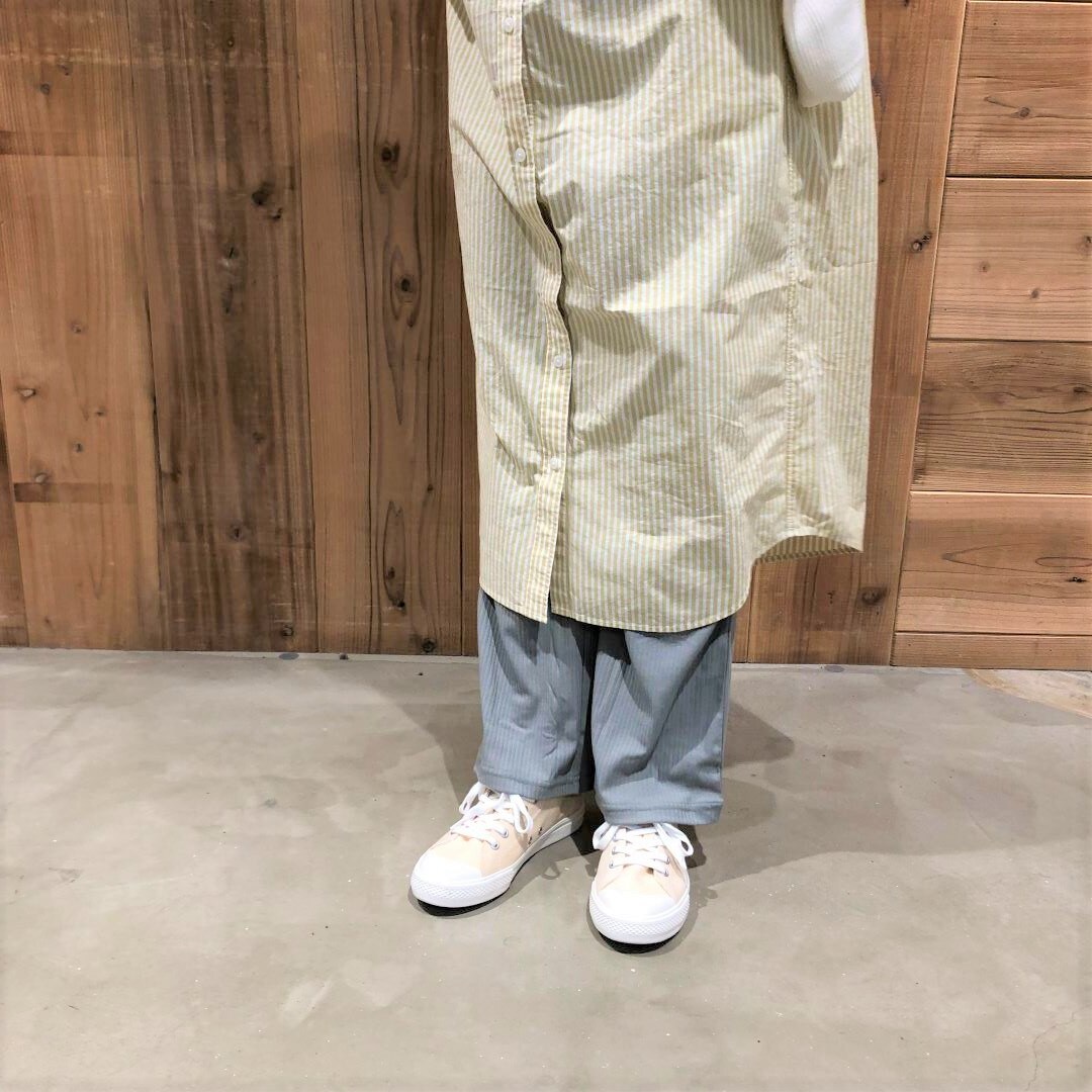 肩掛けしたニットやキャップは同系色でまとめるとすっきりした爽やかなコーデになります。
