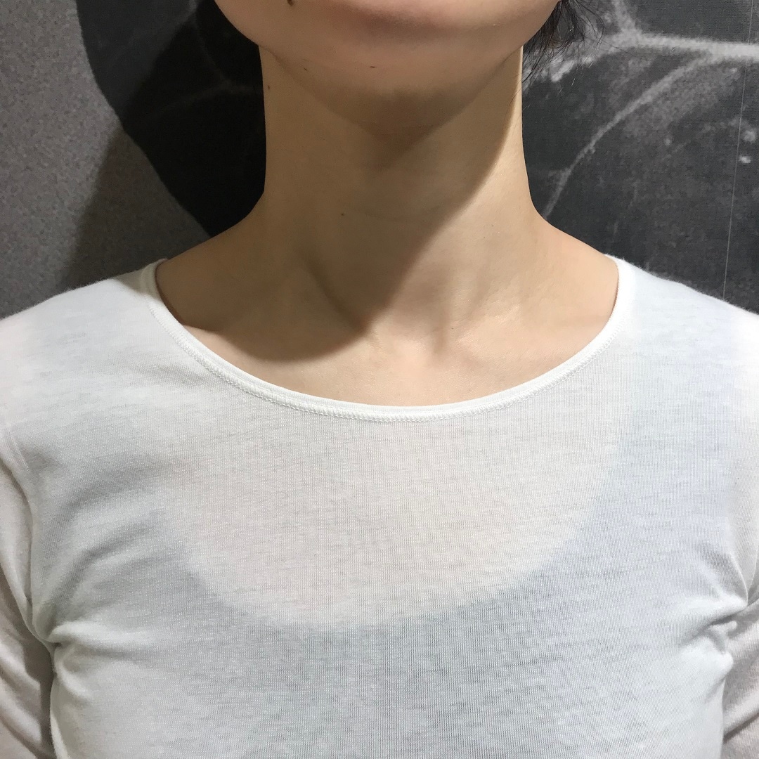 重ね着した時の見え方を意識して、襟ぐりをTシャツ仕様にしています。