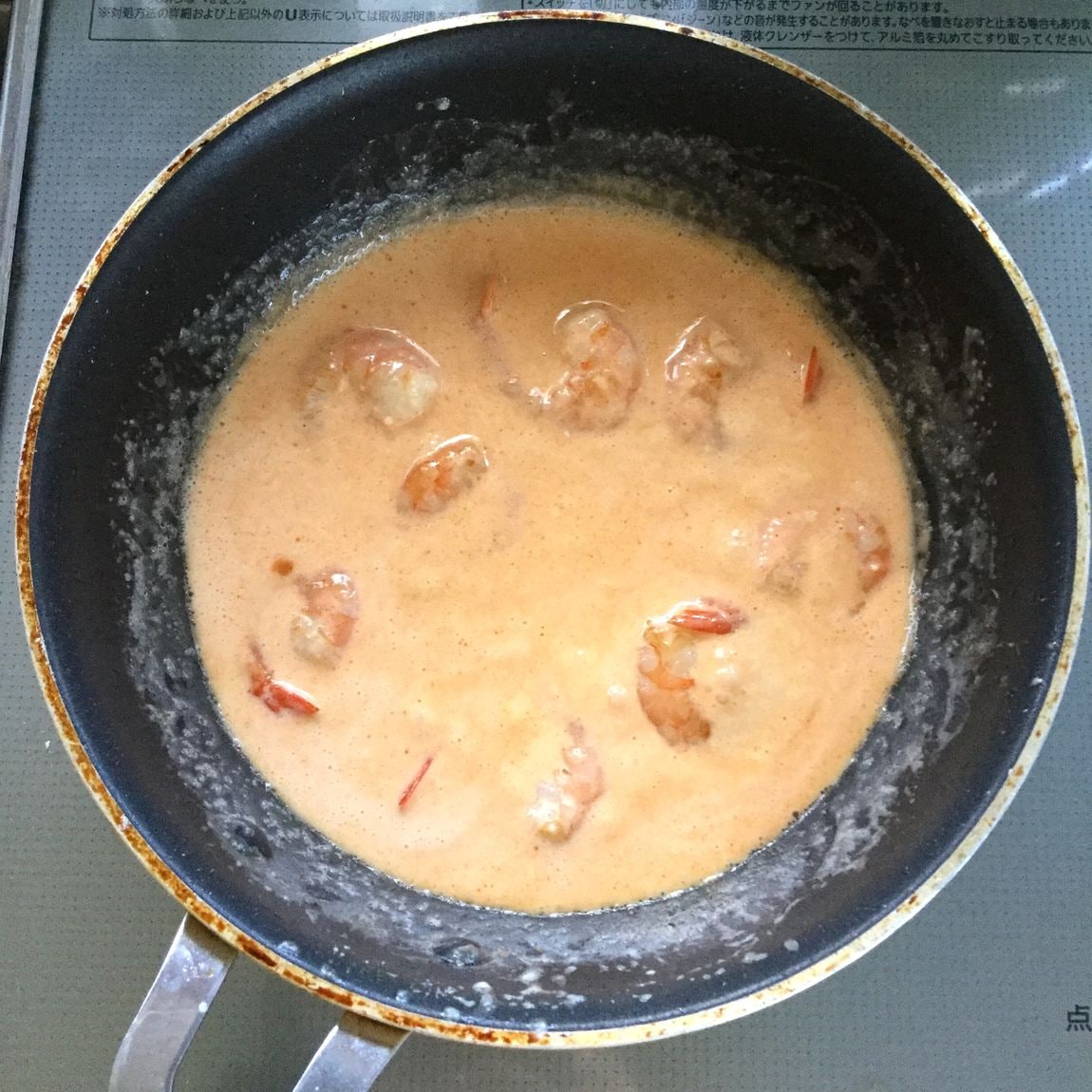 3.オリーブオイルでエビを炒め、生クリームと海老クリームを入れ煮立たせる。