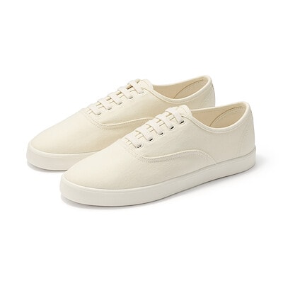 カラーは、キャンバススニーカーが オフ白・チャコールグレー・黒、スリッポンスニーカーが オフ白・黒 の展開です。