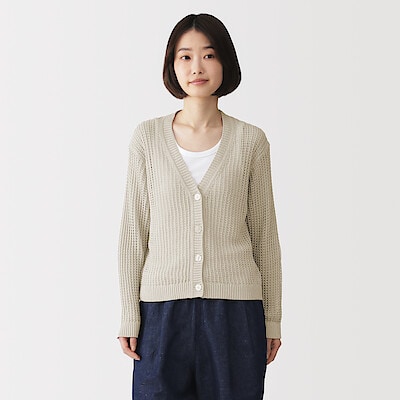 リネン混透かし編みⅤネックカーディガンの2アイテムです。