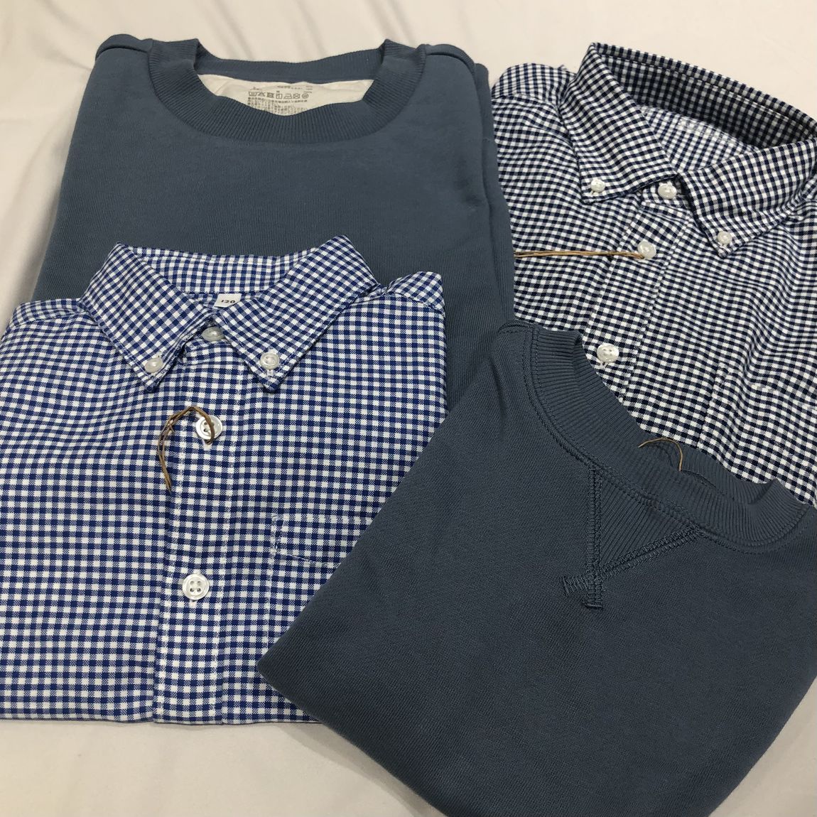 全体的に同系色で、ブルーのチェックシャツにブルーのスウェットを肩掛けで揃えました。