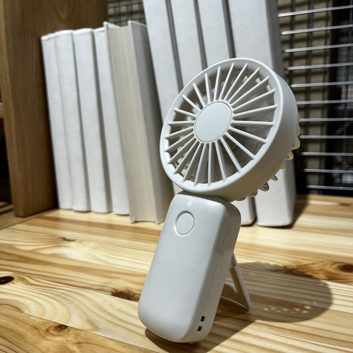 持ち運びがしやすいスリムなサイズですが、風量は十分。持ち手を折り曲げることでデスクなどにも置いてご利用頂けます。