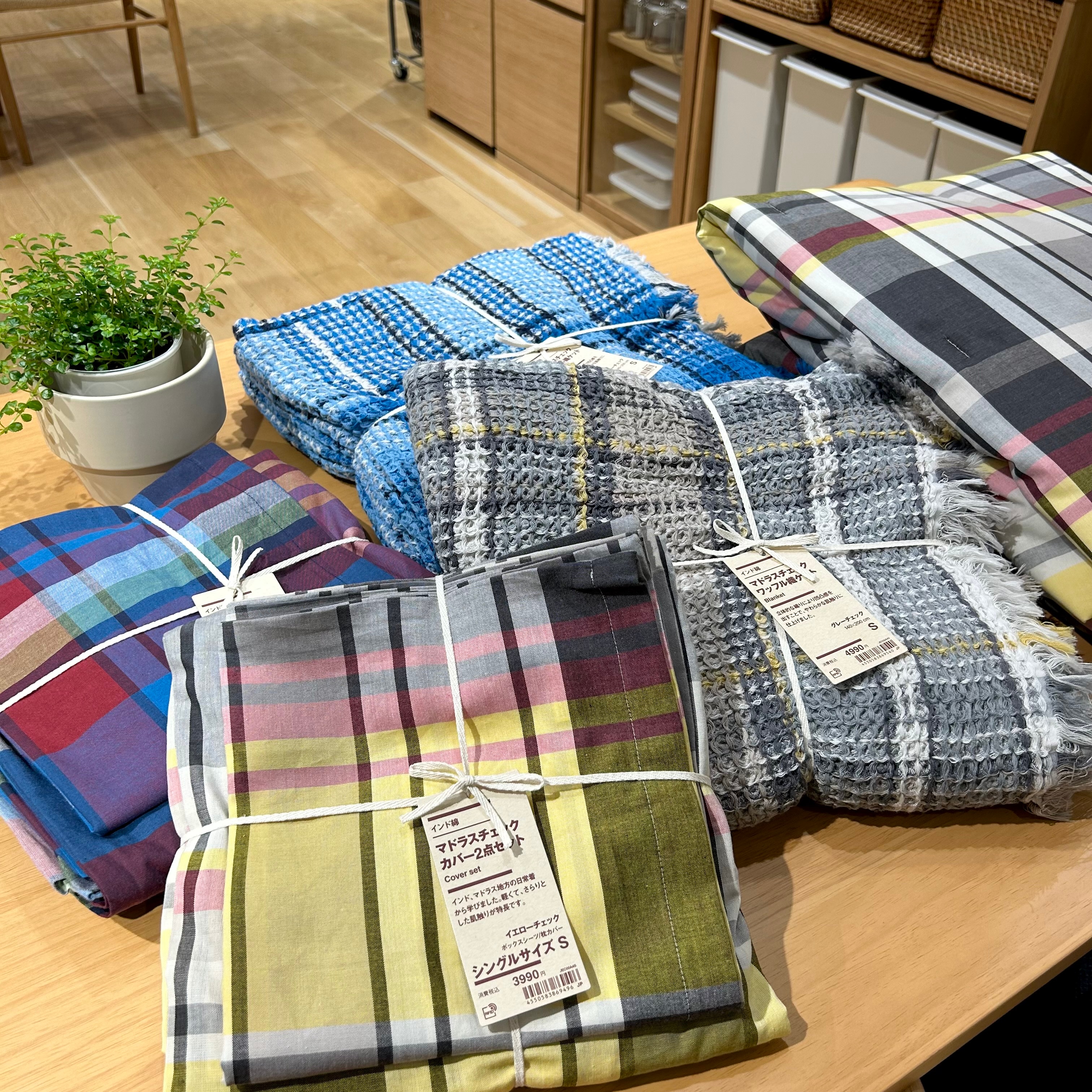 無地の柄の商品イメージが強い無印良品。ベッド展示横にて、マドラスチェックコーナーを