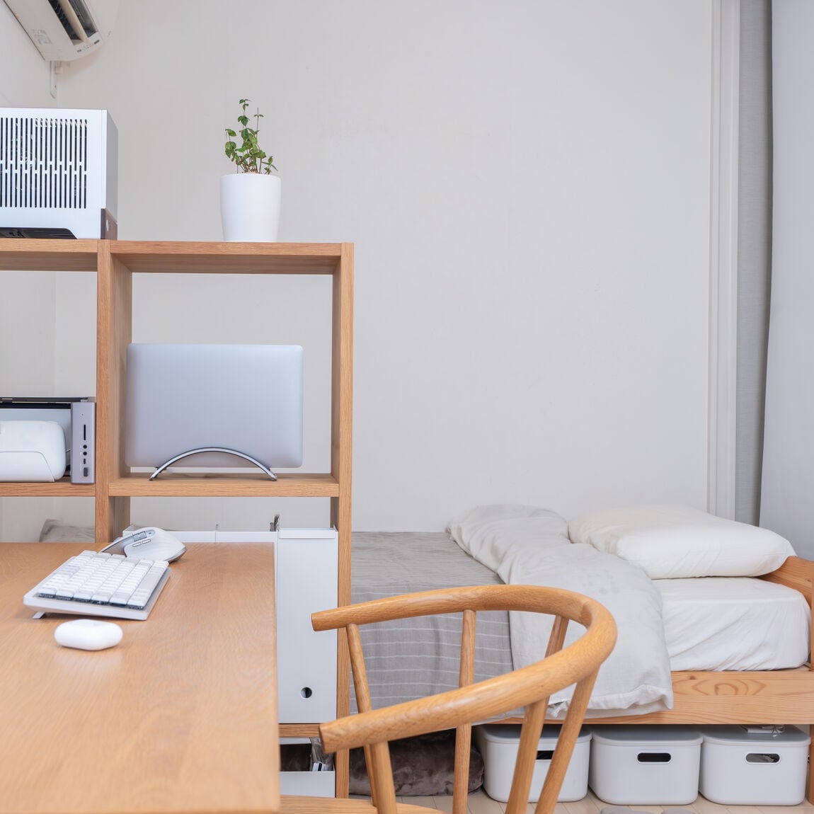 木製の家具を基調としつつ、ダストボックス、サーキュレーター、収納用品などは白で揃えています。