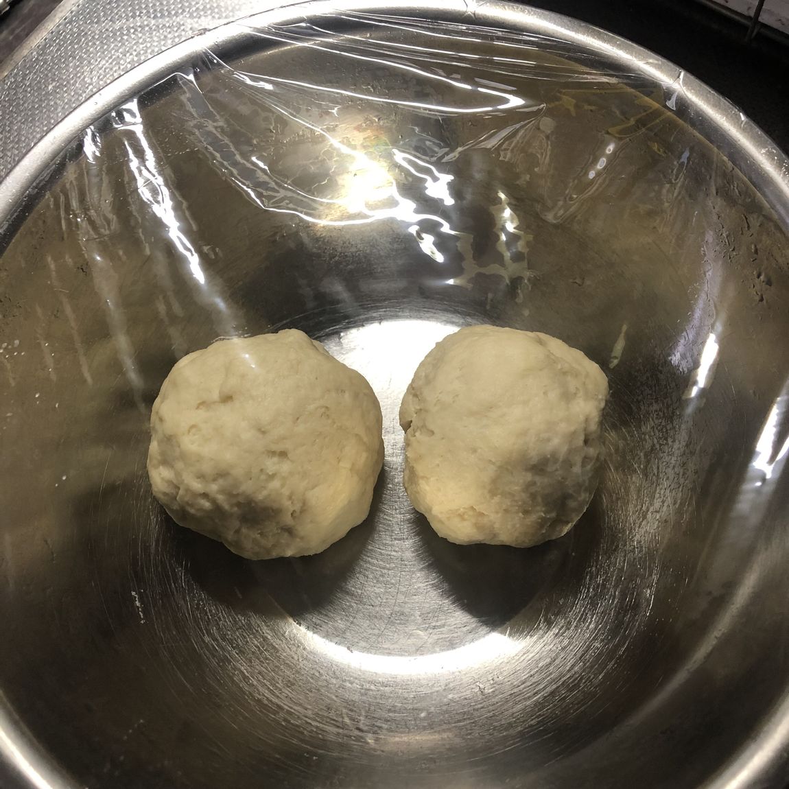フライパンで作るナン1袋、水100ml、オリーブオイル小さじ1を5分ほど手でよくこね、手につかなくなったら2個に分割して、10分ほど寝かします。