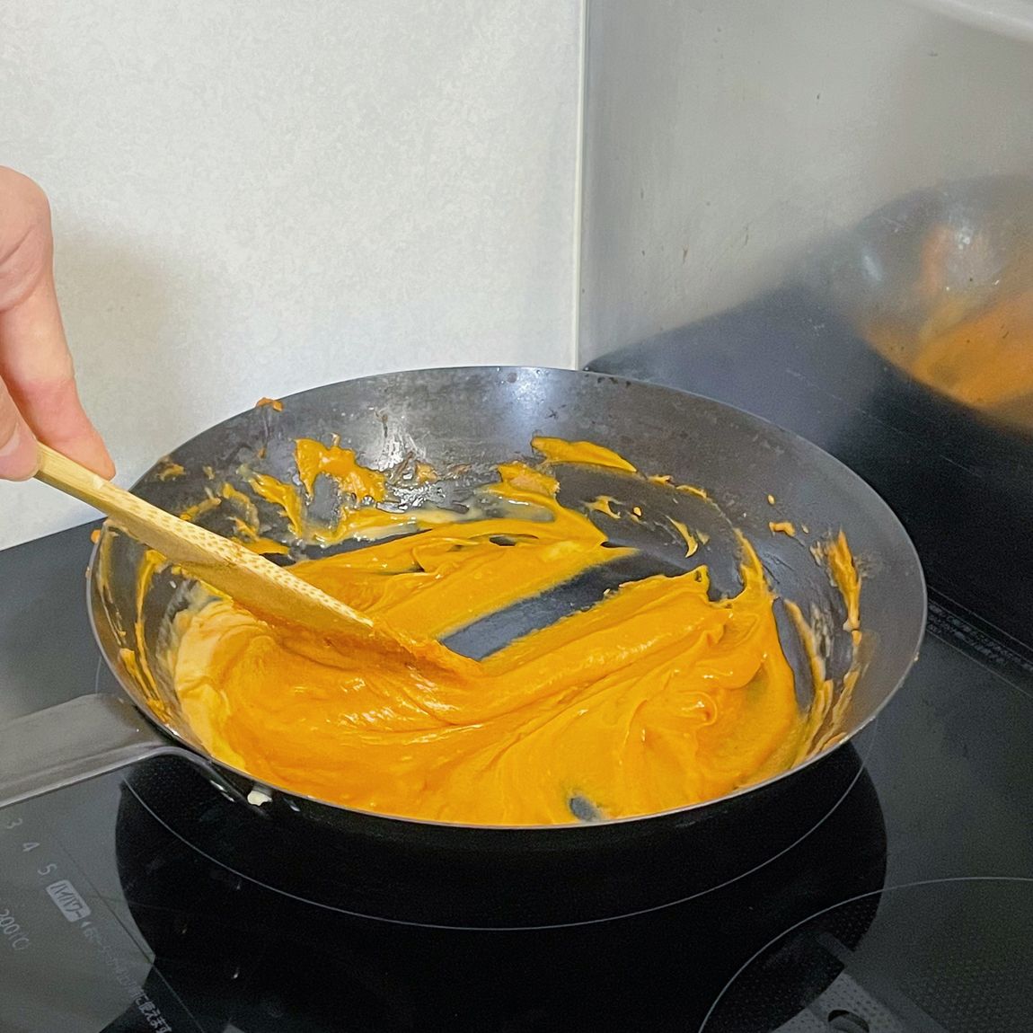 1、フライパンに有塩バター、薄力粉をいれて弱火で熱し、ひとまとまりになるまで炒めます。