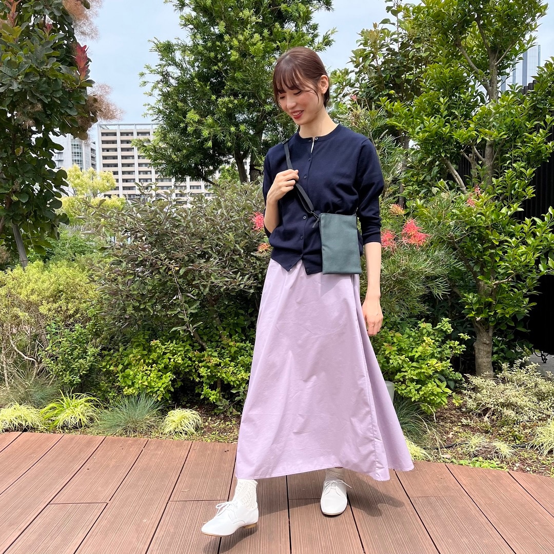 【スタイリング】トップスは紺色で引き締めて、足元は白のレザーシューズで軽やかにコーディネートしました。収納力もあるサコッシュとUVカットのカーディガンがあれば、夏の日差しも気にせずお出かけが楽しくなりますね。