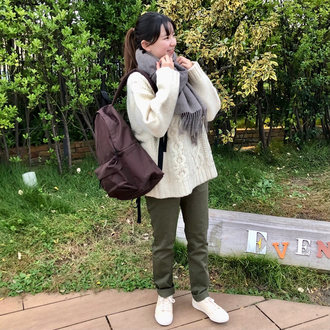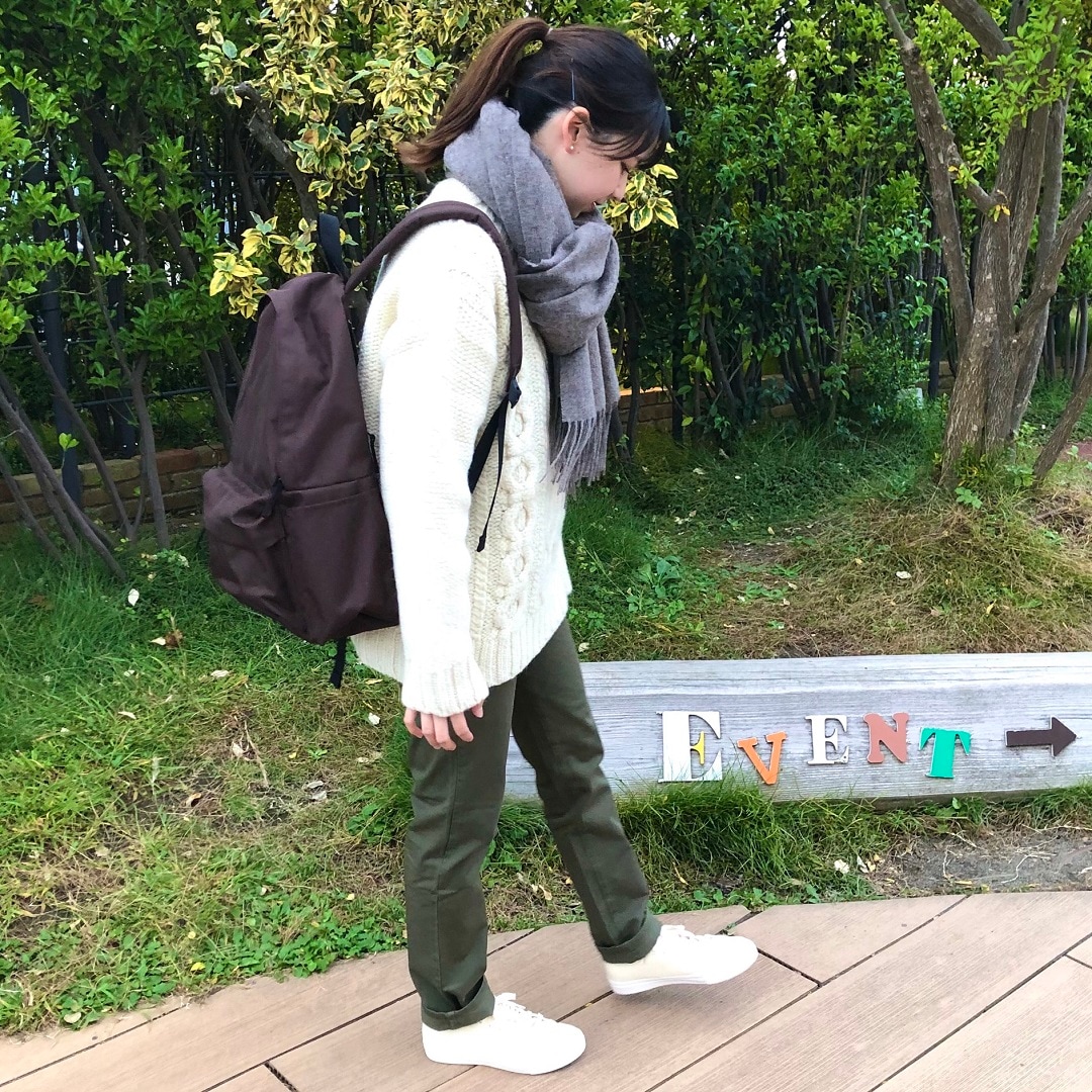 厚めのニット、大判ストールで顔周りにボリュームがあるため、すっきりと細く見せてくれる、テーパードパンツを合わせています。