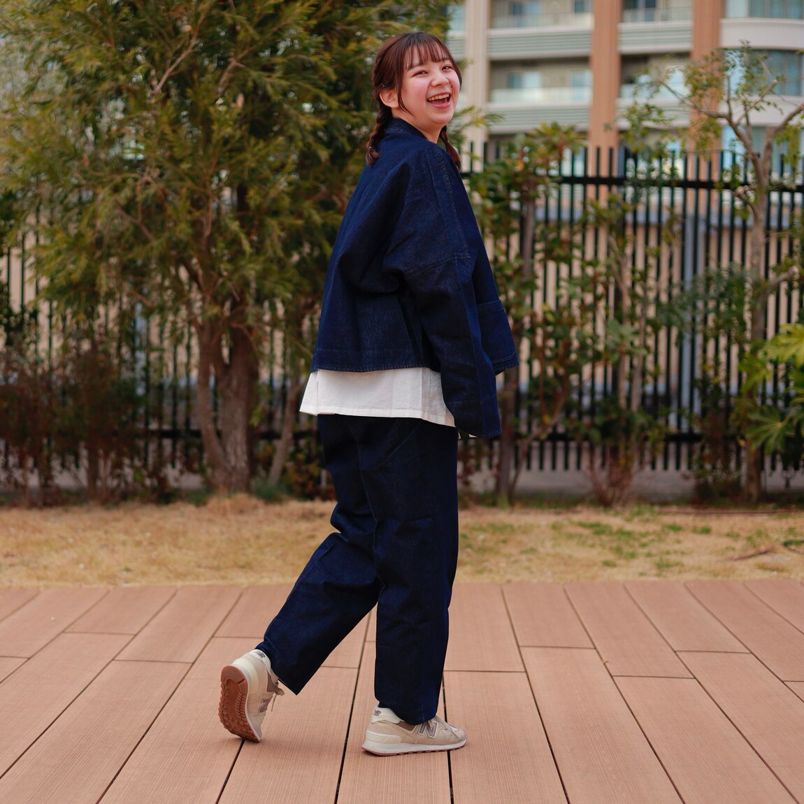 軽い繊維の和紙を使用したデニム生地です。さらりとした風合いが特長です。 セットアップでのスタイリングもおすすめです。