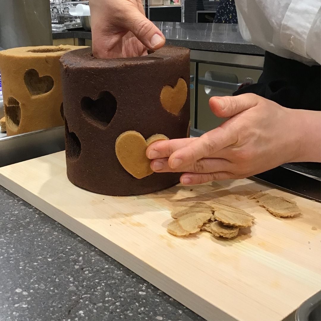 お気に入りの型を使って、特大バウムの側面をくり抜きます。