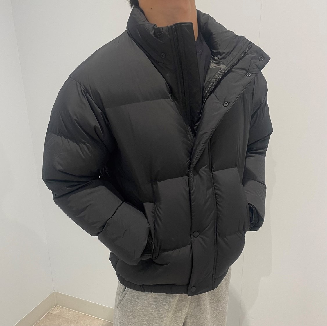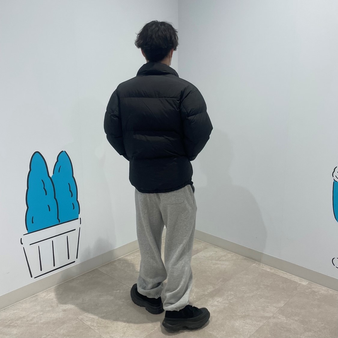軽量ダウンポケッタブルジャケットとスウェットパンツを使ったコーディネートです。
