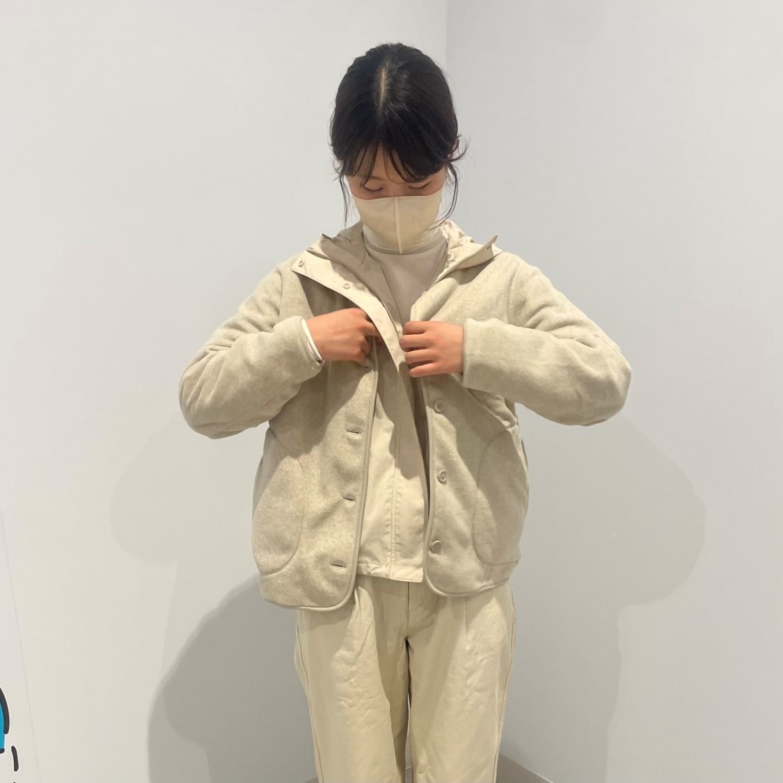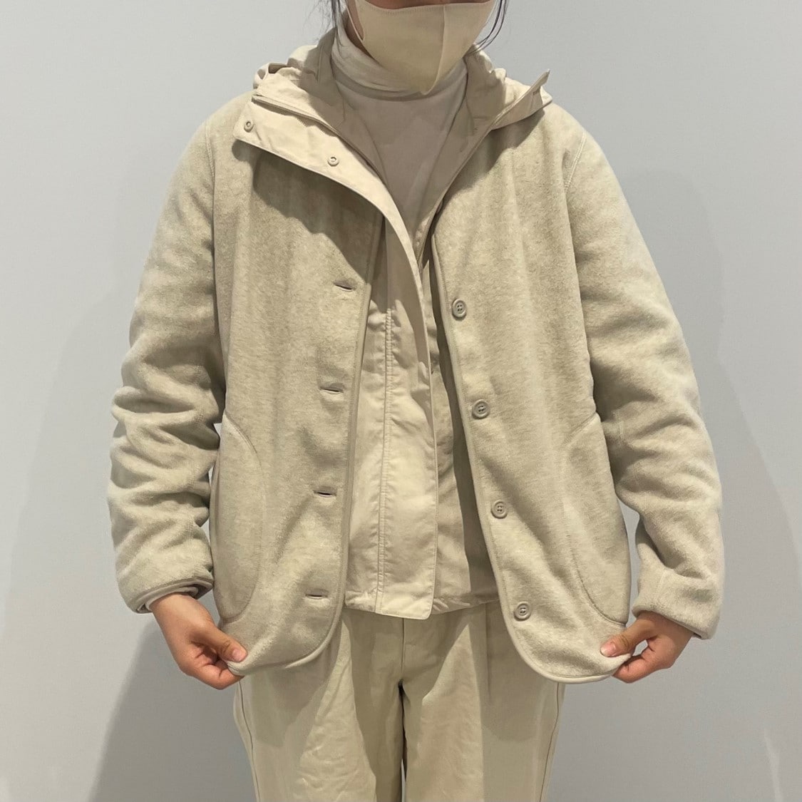 素材に還るフリースカーディガンを使ったコーディネートです。