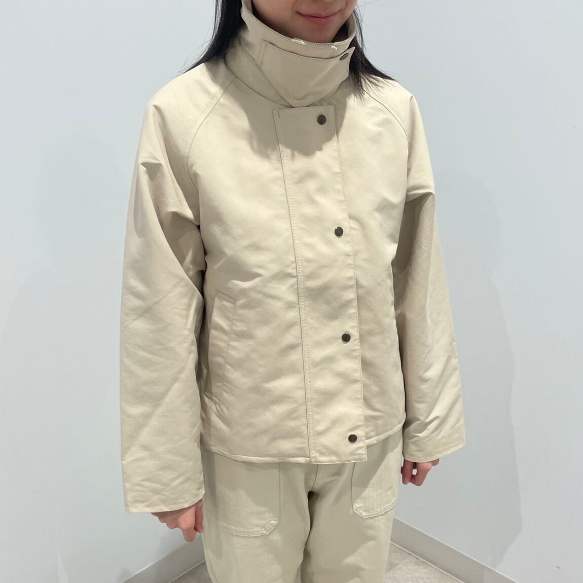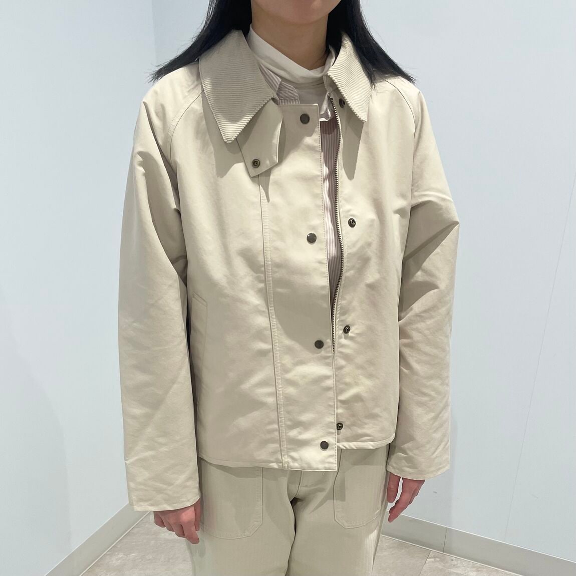 撥水・防風加工の表地を使いました。あたたかいコーデュロイ衿が特長です。 表地には撥水・防風・UVカットの機能を備えた素材を使用しており、 風の侵入を防ぐチンタブや袖口のスナップボタンで保温性を高めています。 着丈は短めで、ワイドシルエットのパンツやスカートとも合わせやすいデザインです。