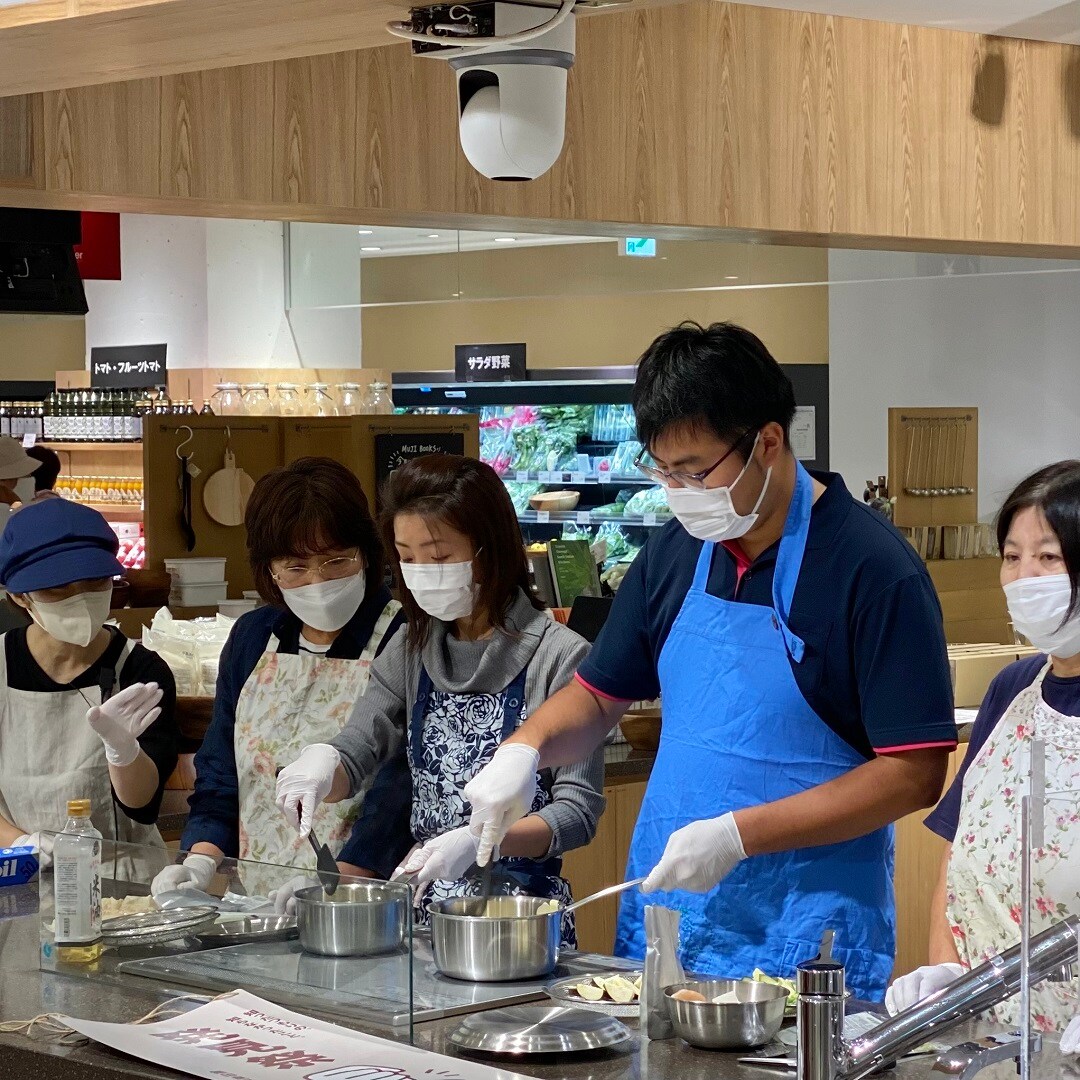 キッチンスタッフと日ごろの食生活の話や料理の悩みを話し合ったり、調理道具の使い方の説明を聞きながら調理をしたりしているうちに、キッチンカウンターはカレーの良い香りでいっぱいになりました。カレーに入れる野菜を先に炒めることでコクを出し、ほたては最後に入れることで縮まないようにするなど、調理時のコツも伝えました。